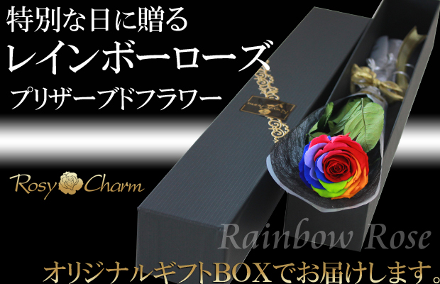 レインボーローズのプリザーブドフラワーで、茎も全てプリザーブドフラワーのバラは珍しい、当店オリジナル商品です♪